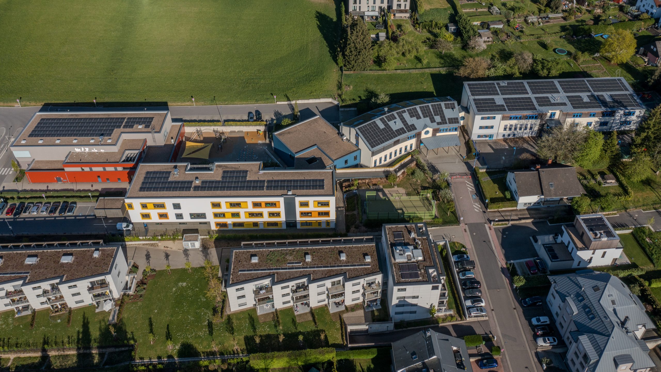 | Betriebskonzept: | Der gesamte erzeugte Strom wird vor Ort genutzt, vorrangig auf dem Schulcampus in Helmsange, einschliesslich der Maison-Relais und der Sporthalle. Überschüssige Energie wird für das Gemeindegebäude in Walferdingen, die Sporthalle in Walferdingen sowie für die Schule, die Sporthalle, die Maison-Relais und die Kindertagesstätte in Bereldingen verwendet. |